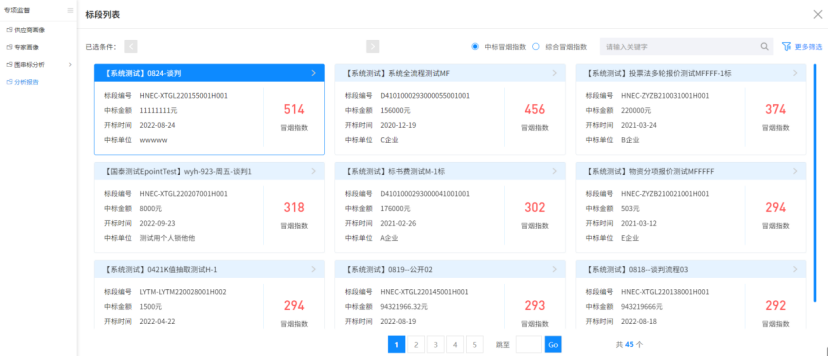 系統按照9類采購方式共設置214項監督指標(其中圍串標預警指標52項),通過開發風險監督點管理、圍串標專項分析、預警督辦處理、大數據挖掘分析、實時監控預警等功能,實現招采活動“事前預警提醒、事中跟蹤分析、事后總結追溯”的全景式與穿透式監督。