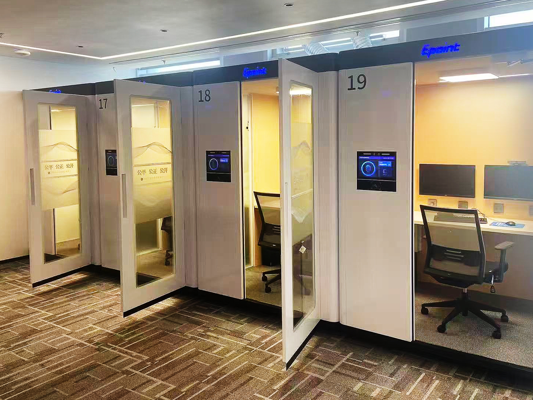走進交易中心評標室,映入眼簾的是一排排采用鋁合金型材、環保高效吸音材料,及高強度吸音鋼化玻璃一體化打造的獨立“智能評標艙”。每個艙體配備低噪聲新風系統,為每位專家營造出“一人一艙”的封閉式專屬評標空間;專家“刷臉”進入,全程佩戴智能胸牌,人員軌跡無感、實時記錄,從物理環境上筑牢了評審獨立性與公正性的第一道防線。